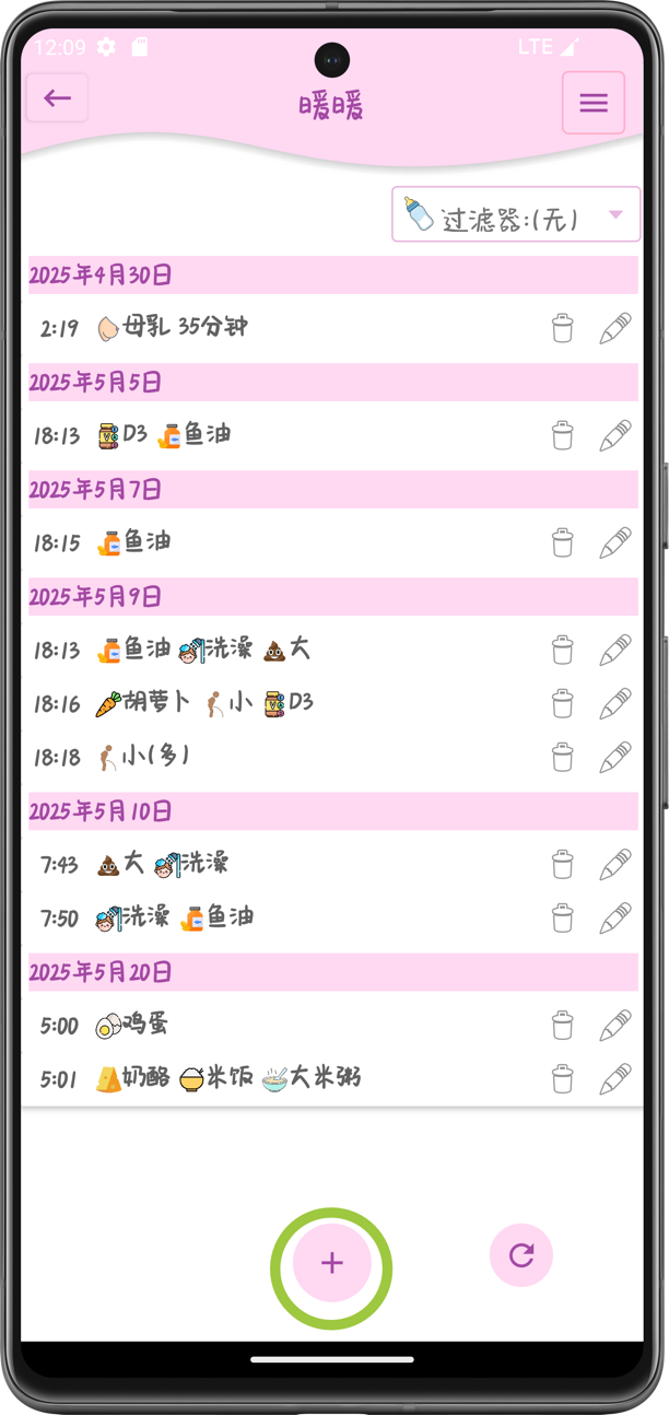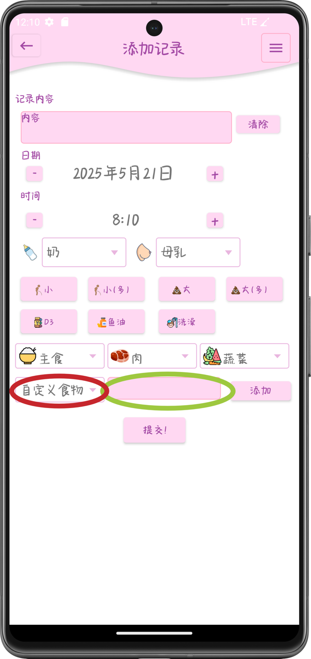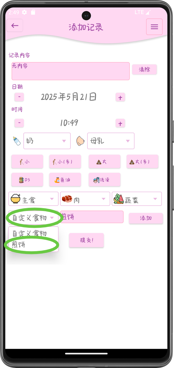 3.以后再次添加刚才输入的辅食,可通过自定义食物下拉框添加